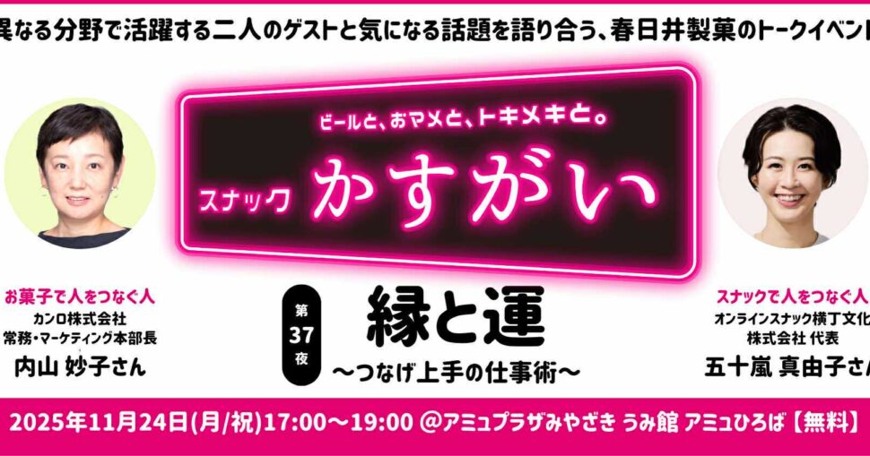 各界で活躍する二人のゲストと、訊きたがりのマスターが織りなすトークを楽しむ「スナックかすがい」が、宮崎で3年ぶりに開店します。